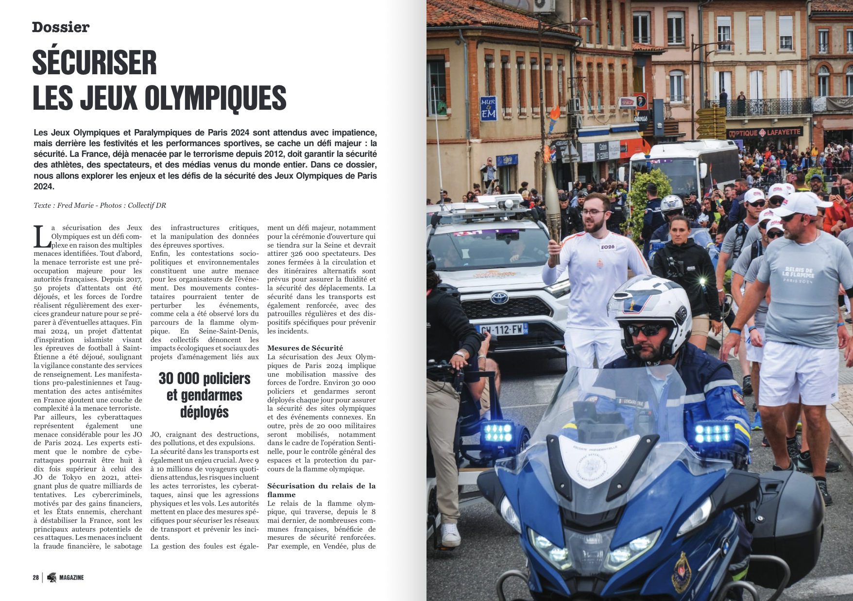 Tout d’abord, notre dossier central est consacré à la sécurisation des Jeux Olympiques, un rendez-vous d’envergure mondiale qui exige des mesures de sécurité hors normes. Face aux nombreuses menaces qui pèsent sur l'événement, (terroristes, cyber, etc), quels sont les moyens déployés par les autorités et sont-ils suffisants ?