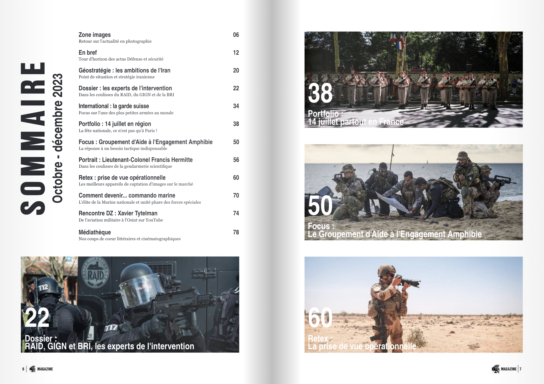 Enfin, vous retrouverez des portraits d’experts passionnés et passionnants, les dernières actualités du secteur Défense qu’il ne fallait pas rater, nos analyses géostratégiques ainsi qu’un dossier “Retex matériel” axé sur la prise de vue opérationnelle. Du drone à la caméra d’action, en passant par les boîtiers et objectifs photo, nous vous présentons ce qu’il se fait de mieux sur le marché en 2023.