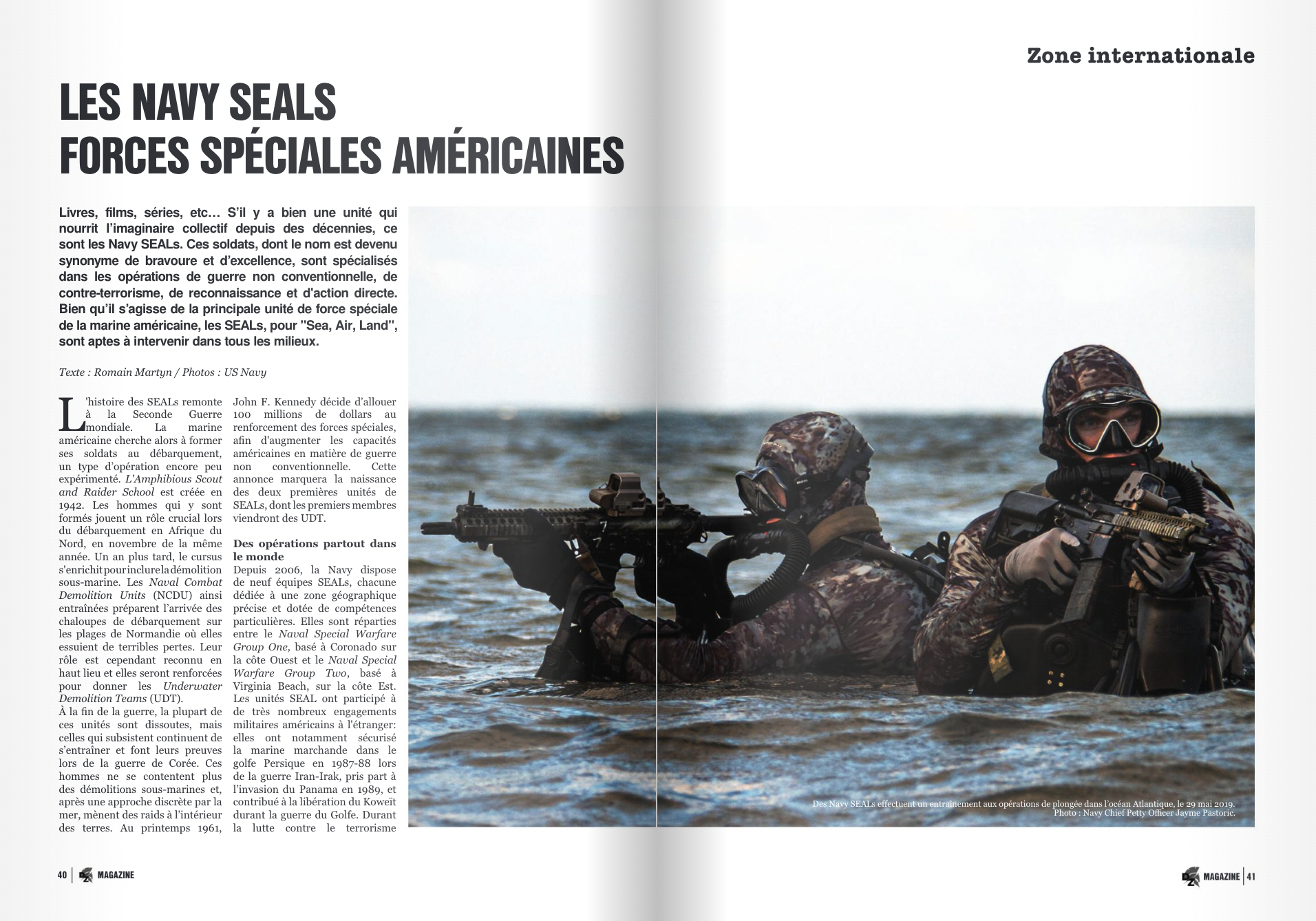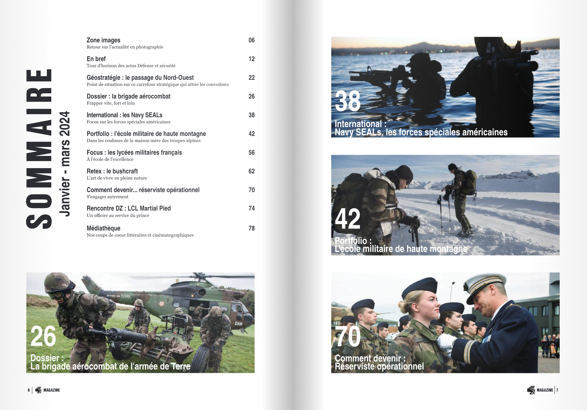 Enfin, après un rapide passage par Monaco pour un portrait original, nous chausserons les skis avec les troupes alpines pour un portfolio sur l’école militaire de haute montagne à Chamonix et nous ferons également un éclairage sur les Navy SEALs dans notre rubrique internationale.