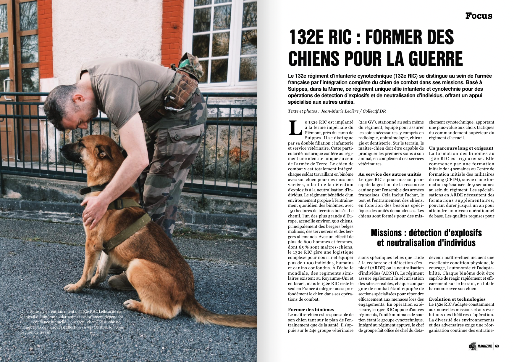 Dans notre rubrique "comment devenir", un article pratique vous guide à travers les étapes de recrutement et de formation des opérateurs de défense sol-air. Nous vous emmenons également à la rencontre des soldats du 132e régiment d’infanterie cynotechnique (RIC), une unité unique en France.