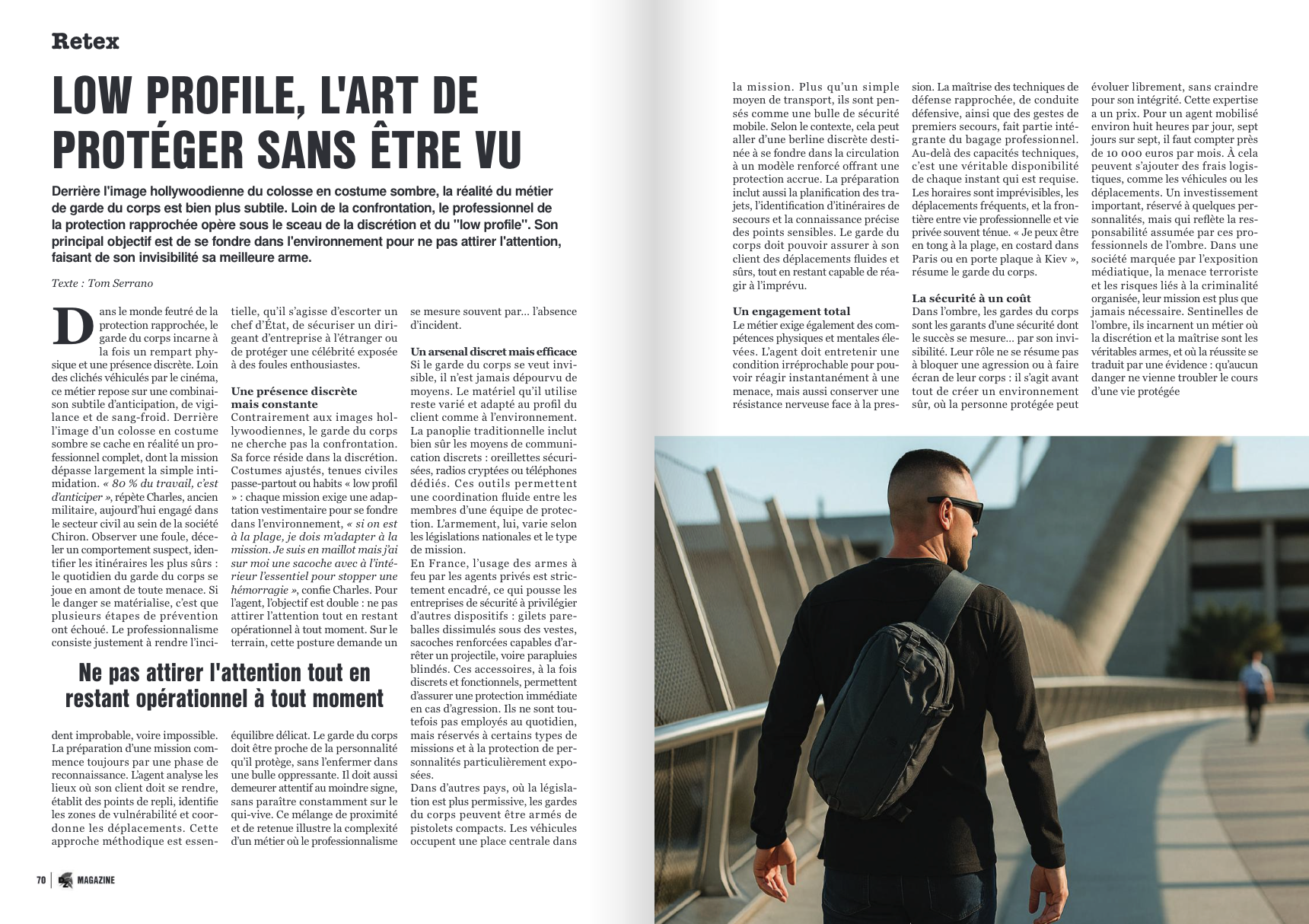 À l’autre bout du spectre, alors que les incendies marquent chaque été, nous avons enquêté sur la formation des pilotes de bombardiers d’eau, dont la mission exige sang-froid et technicité. Enfin, nous analysons les pratiques du low profile, ces techniques et équipements discrets utilisés par les professionnels de la protection rapprochée.