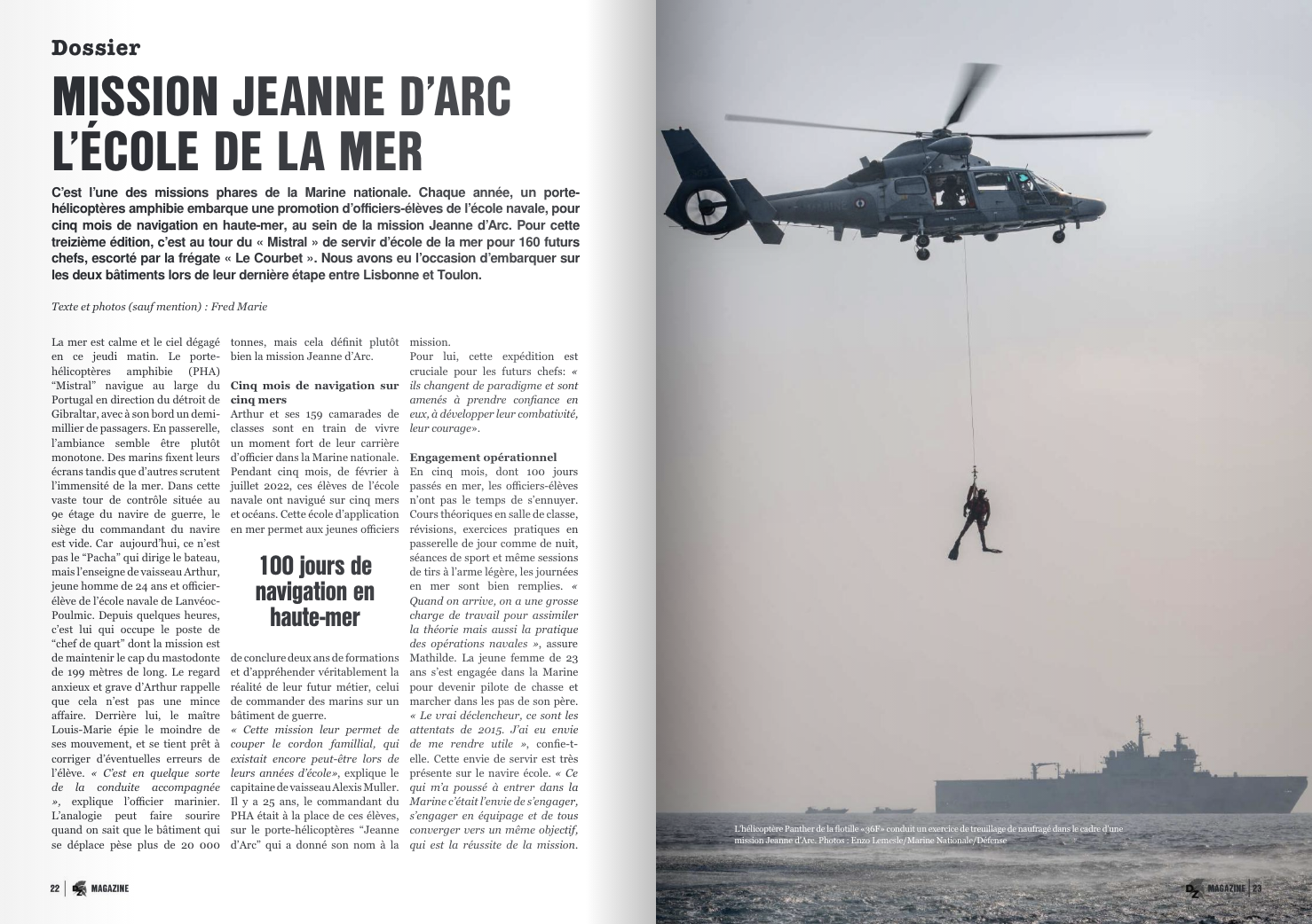 Une fois encore, vous partez avec nous sur le terrain pour des reportages exclusifs et toujours au plus proche des forces armées ! Si vous êtes abonnés à Défense Zone, vous avez l’habitude de retrouver, dans notre magazine, des immersions en France et à l’étranger... Mais nous n’étions pas encore partis ensemble en haute-mer. C’est donc chose faite avec un dossier spécial sur la mission Jeanne d’Arc, l’école de la mer des futurs officiers de la Marine nationale. Nous avons été invité à bord du porte-hélicoptères amphibie Mistral ainsi que de la frégate Le Courbet pour vivre le quotidien des marins en mission.
